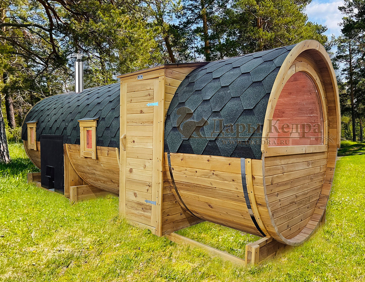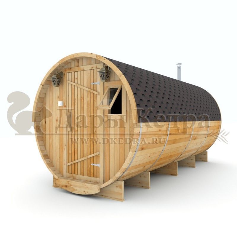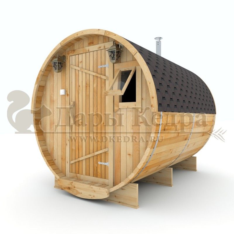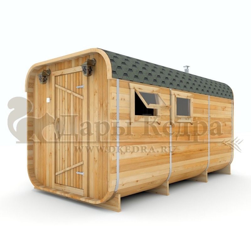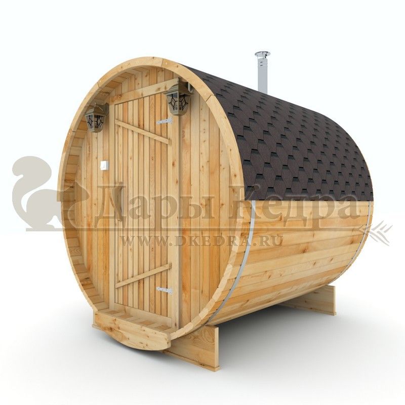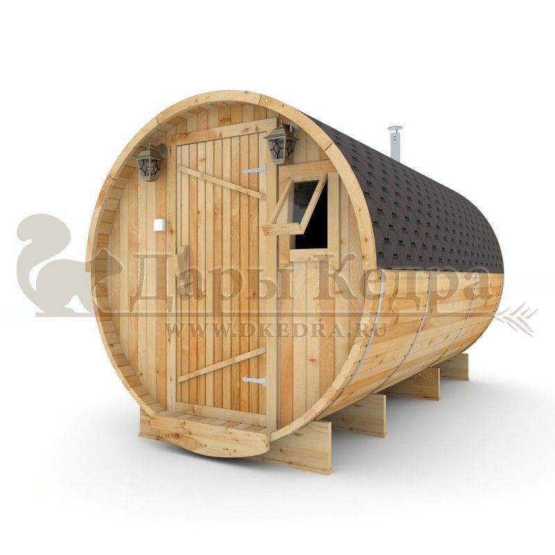 Баня-бочка буханка из кедра с боковым входом (все размеры) Это самая просторная модель бани. Благодаря этому ее можно использовать не только по назначению, но и в качестве летнего домика. Боковой вход у такой модели находится в начале или в середине конструкции. Моечная оснащена душевым поддоном. Двухуровневый открытый полок и лавочка в парилке сделает принятие процедур более комфортным. По вашему желанию баню-бочку можно дополнить печью с внешней загрузкой, благодаря которой весь мусор после топки останется на улице. Баня-бочка буханка из кедра с боковым входом не требует полноценный фундамент, поэтому при необходимости ее можно перенести в другое место. Обращаем Ваше внимание, что в стандартную комплектацию бани входят полки открытого типа в парной с обеих сторон. Дополнительно можно заказать полок закрытого типа или лавку! Кедр обладает ароматическими свойствами. Он не деформируется и влагоустойчив, при правильном уходе за деревом на нем не развиваются грибки и плесень.