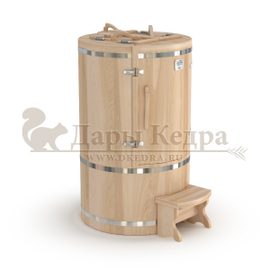 Готовый комплект - это полностью укомплектованный набор с фитобочкой для процедур парения. Круглая модель наиболее компактна и мобильна. Толщина стенок составляет 25 мм. Фитобочка оборудована откидными створками, дверцей и отверстием для головы. Во время парения человек сидит внутри кедровой бочки, а голова находится снаружи. Благодаря этому исключается возможность перегрева. Подлокотники из кедра, встроенные ручки на створках и двери делают эксплуатацию более удобной.