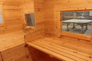 Домик подходит для дачного использования в теплое время года или обустройства загородных баз отдыха. Его можно разграничить на две зоны и использовать как кухню и спальное помещение. Домик оборудован увеличенным окном, четырьмя лежаками из кедра, вешалкой и полкой из кедра. Для удобства пользования кемпинг дом можно укомплектовать верандой с лавочками или козырьком.