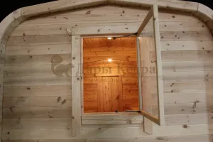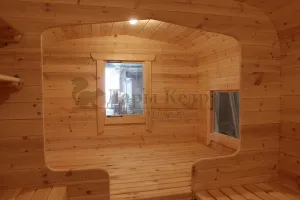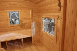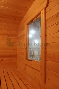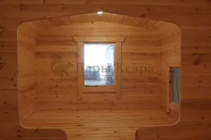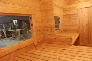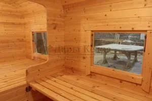 Окна из закаленного стекла (панорамное), можно разместить, как в парилке, так и в комнате отдыха. Может быть установлено только на торцевых (ровных) стенах бани. За дополнительную плату возможно сделать стекло бронзированным.