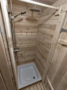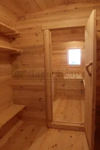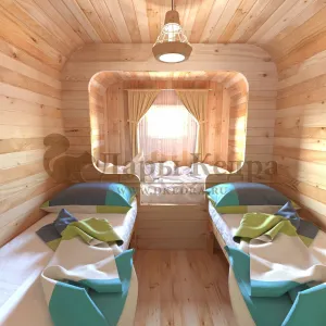 Домик с тремя помещениями подходит для дачного использования в теплое время года или обустройства загородных баз отдыха. Прихожая и кухня занимают одну комнату, в которой стоит стол из кедра. Две другие оборудованы четырьмя деревянными лежаками, по желанию их можно заменить на двуспальные кровати. Либо обустроить санузлом и душевой зоной. Для удобства пользования кемпинг дом можно укомплектовать верандой с лавочками или козырьком.