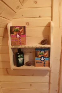В бане: данный вариант полки подойдет для размещения коробок с фитосборами, бутылей с шампунем и других нужных банных предметов.