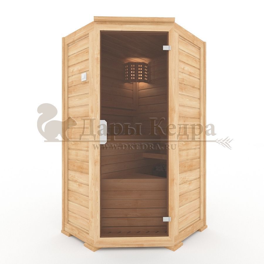 Одноместная угловая финская сауна кабина из кедра с электрокаменкой Это специально оборудованная деревянная кабина для сухого и влажного парения. Электропечь нагревает пространство внутри и позволяет сбрызгивать камни водой, слегка увлажняя воздух. Такая процедура позволяет избежать перегрева. Двойные стенки кабины с теплоизоляционным материалом удерживают тепло. Установка сауны в угол позволяет рационально использовать пространство помещения. Финская сауна с электропечью подойдет как для домашнего использования, так и для коммерции. Доставляется в разборном виде щитами, собирается по инструкции с помощью шуруповёрта. Обращаем Ваше внимание, что в стоимость сауны уже включена дверь с закаленным стеклом в раме из кедра с фиксатором и деревянным фасадом. Вы можете заменить фасад на цельностеклянный с безрамной дверью за дополнительную плату. Нагреваясь, древесина кедра выделяет полезные вещества-фитонциды, которые благотворно влияют на организм в целом и укрепляют иммунитет.