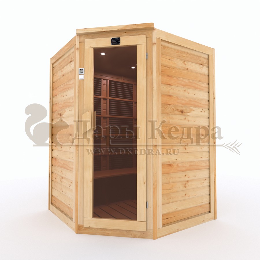 Двухместная угловая инфракрасная сауна кабина из кедра с карбоновыми излучателями Это специально оборудованная кедровая кабина для прогрева тела человека сухим теплом. Воздух в таких парных не нагревается. Инфракрасные лучи воздействуют на тело, равномерно прогревая мышцы, суставы и органы. Карбоновые излучатели, встроенные в стены кабины, обладают мягким прогревом, что полностью исключает возможность ожога. Работает кабина за счет электричества. Установка сауны в угол, позволяет рационально использовать пространство помещения. Подходит как для домашнего использования, так и для коммерции. Обращаем Ваше внимание что в стандартную комплектацию входит трапик для ног, но вы можете его заменить на цельный пол совершенно бесплатно! Целебная древесина кедра и инфракрасные лучи благотворно влияют на организм человека в целом. При регулярном использовании инфракрасной сауны укрепляется иммунитет, улучшается кровообращение и состояние кожи, выводятся токсины.